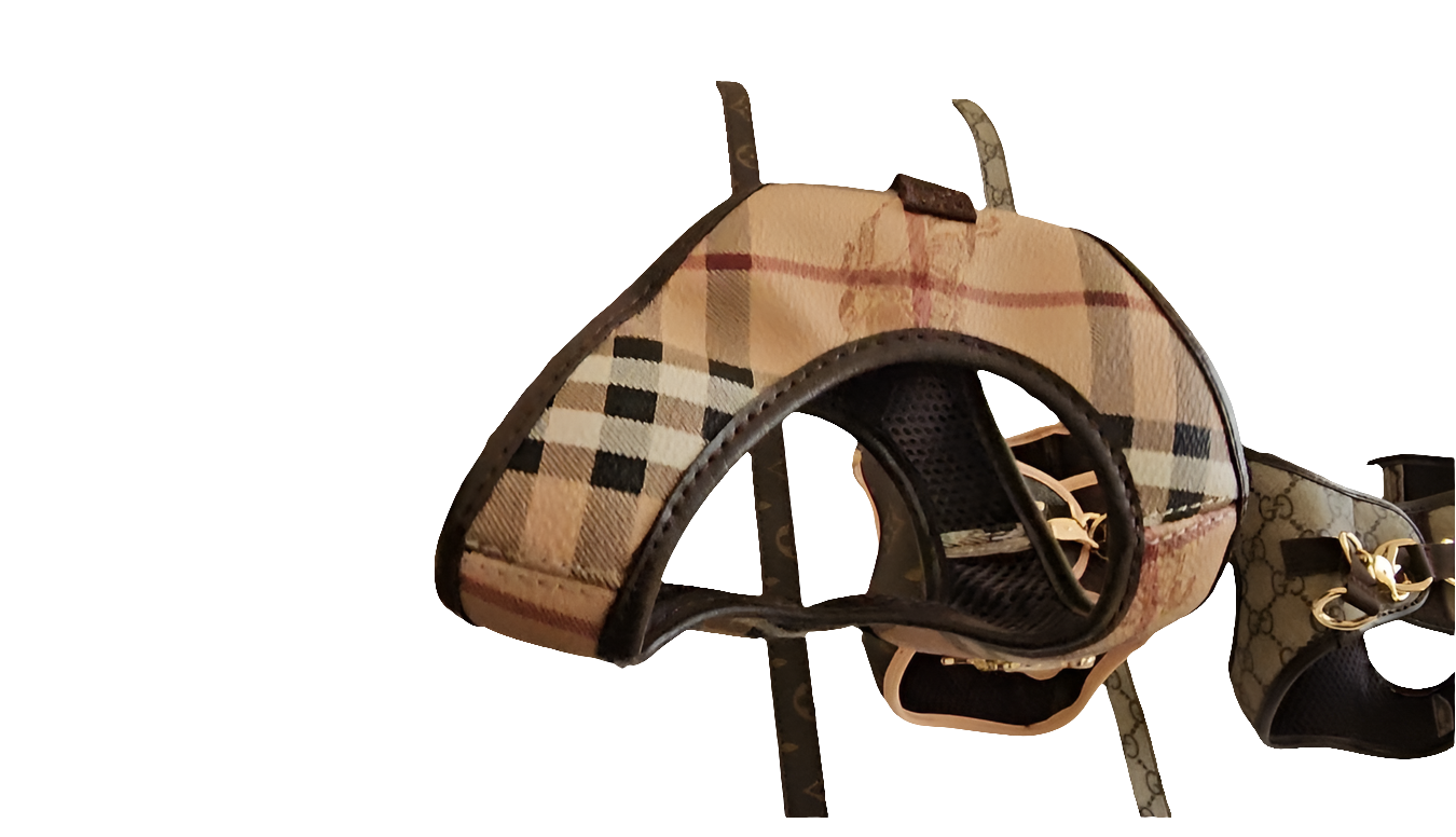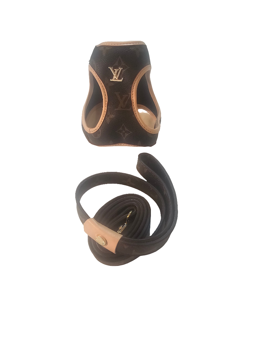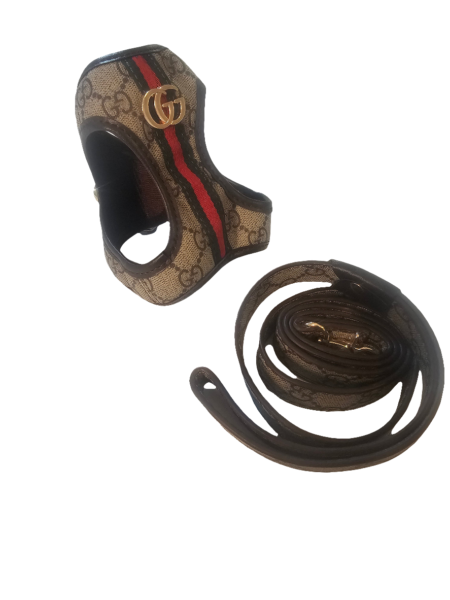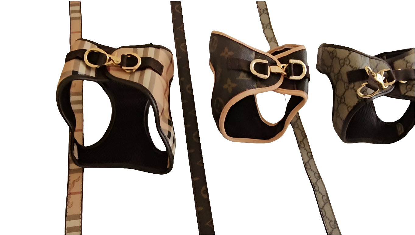 Elegant Designer Dog/Cat Harness with Lead sets in sizes Small and Xtra Small. Beautifully hand made with gold detail for added understatements.