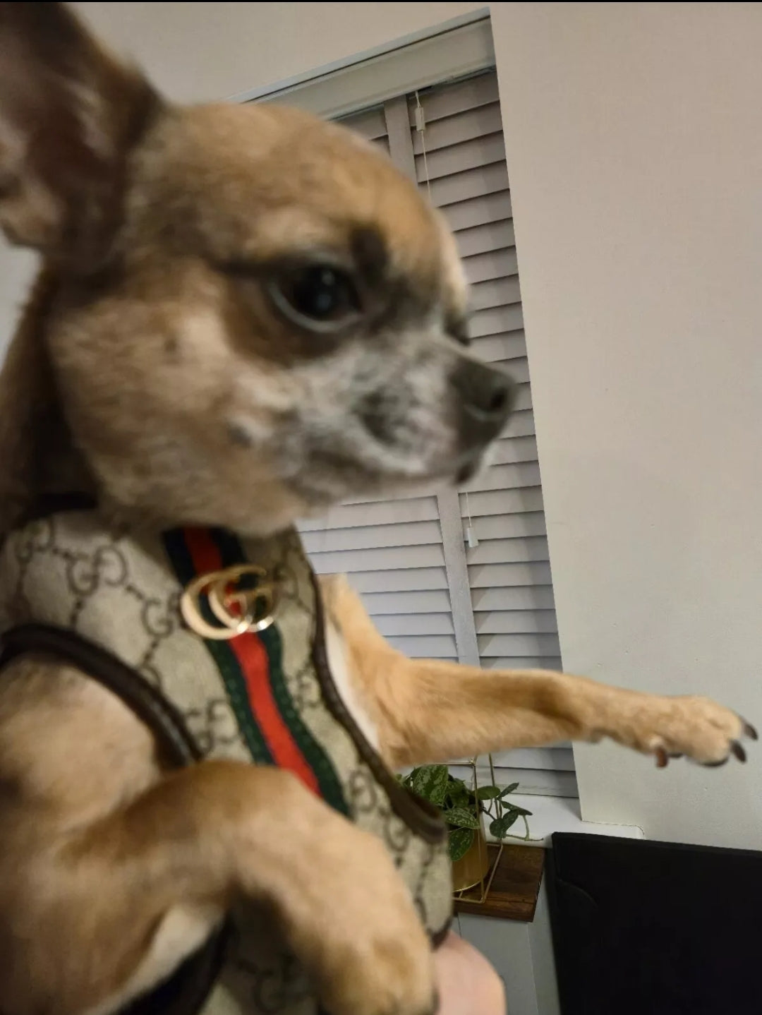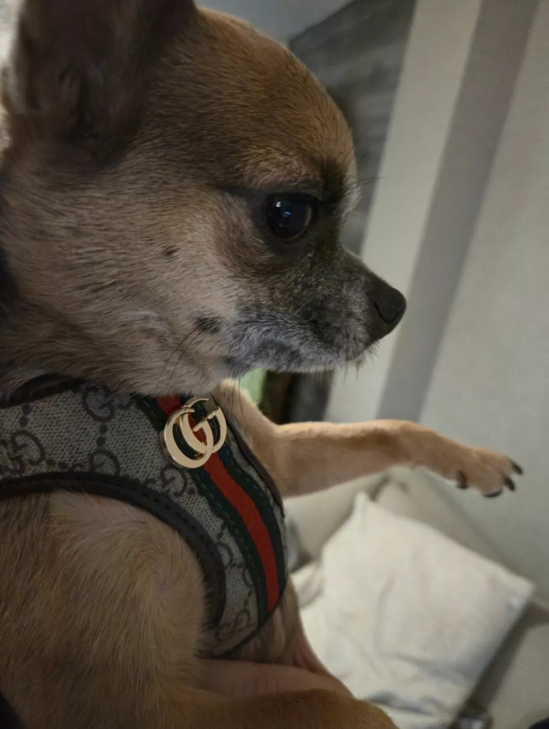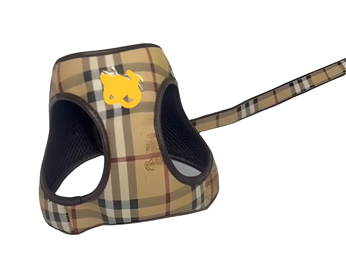 Elegant Designer Dog/Cat Harness with Lead sets in sizes Small and Xtra Small. Beautifully hand made with gold detail for added understatements.